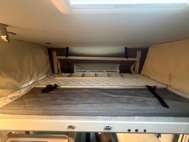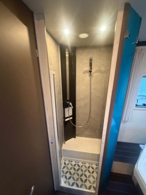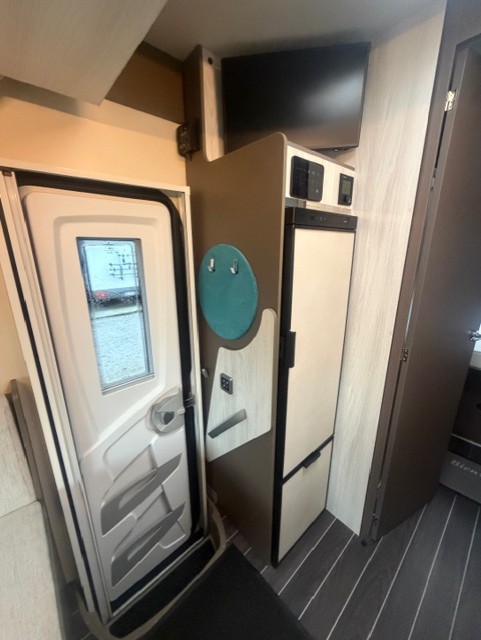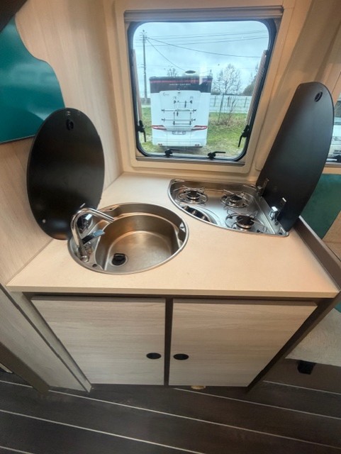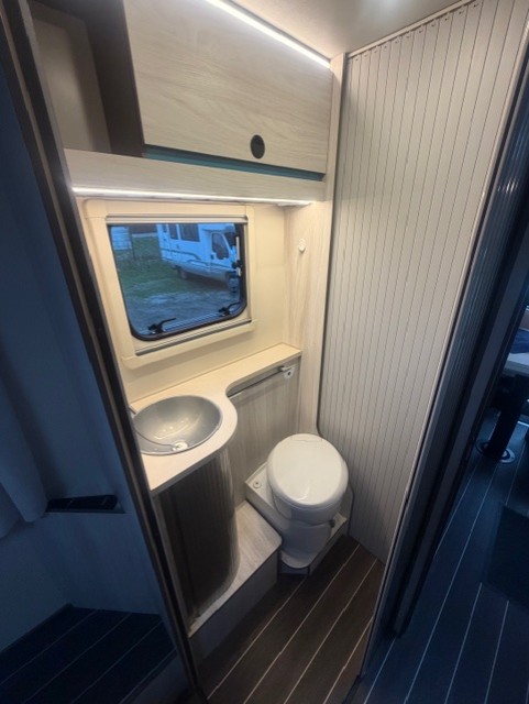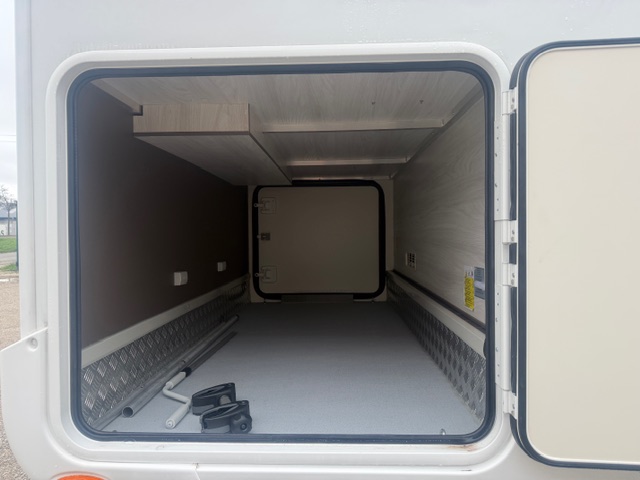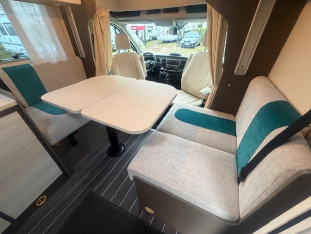 Implantation : Dinette face-face, sièges avant pivotant, Cuisine droite comprenant gaz 3 feux, réfrigérateur slim 141 litres en vis à vis, douche et wc séparés, Lit central, Lit pavillon électrique.