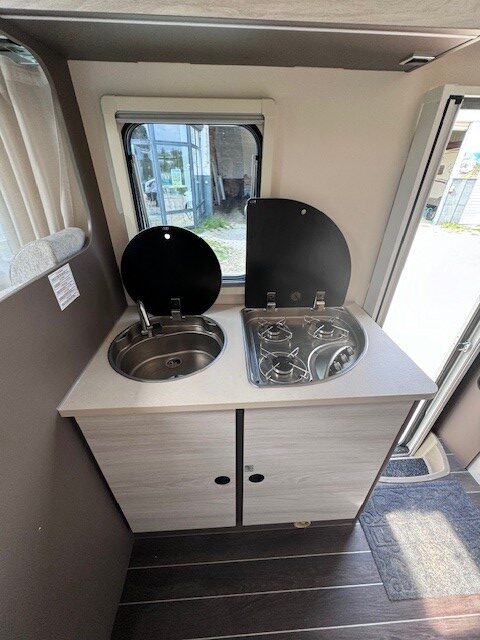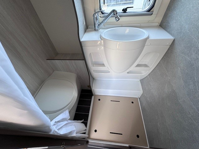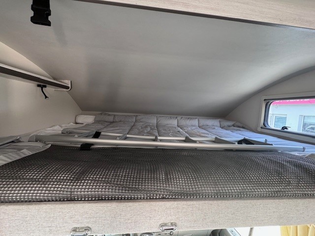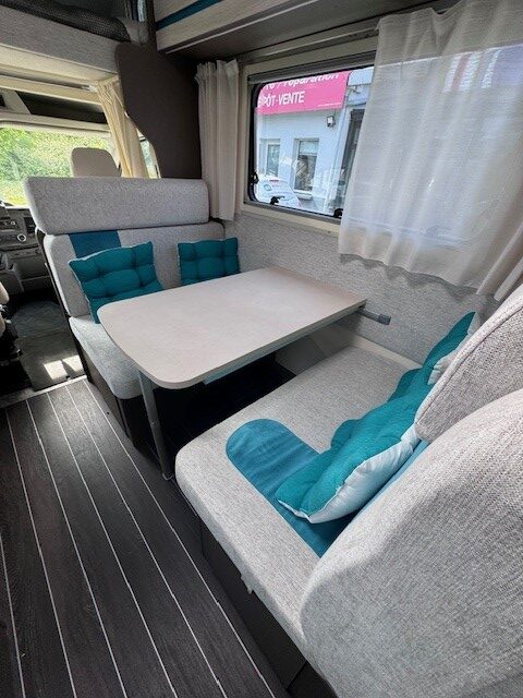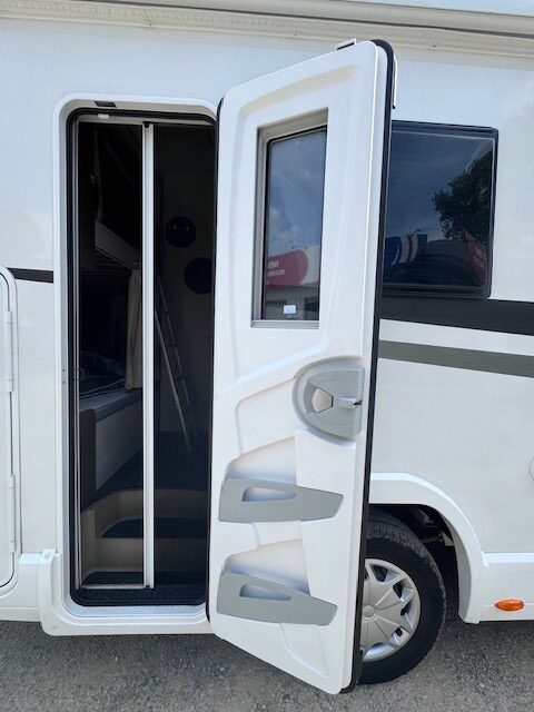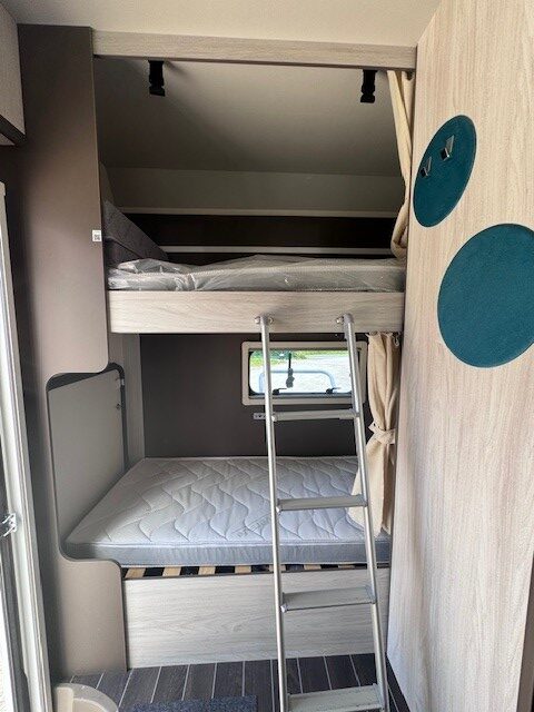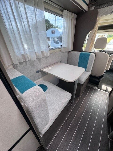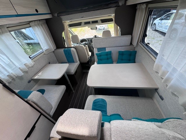 Implantation : Double dinette, sièges avant fixe, Cuisine droite comprenant gaz 3 feux, réfrigérateur 141 litres, douche et wc combinés, Lits superposés, Lit dinette 2 personnes, lit dinette 1 personne, et Lit de capucine. Nombreux rangement, nombreux accessoires.